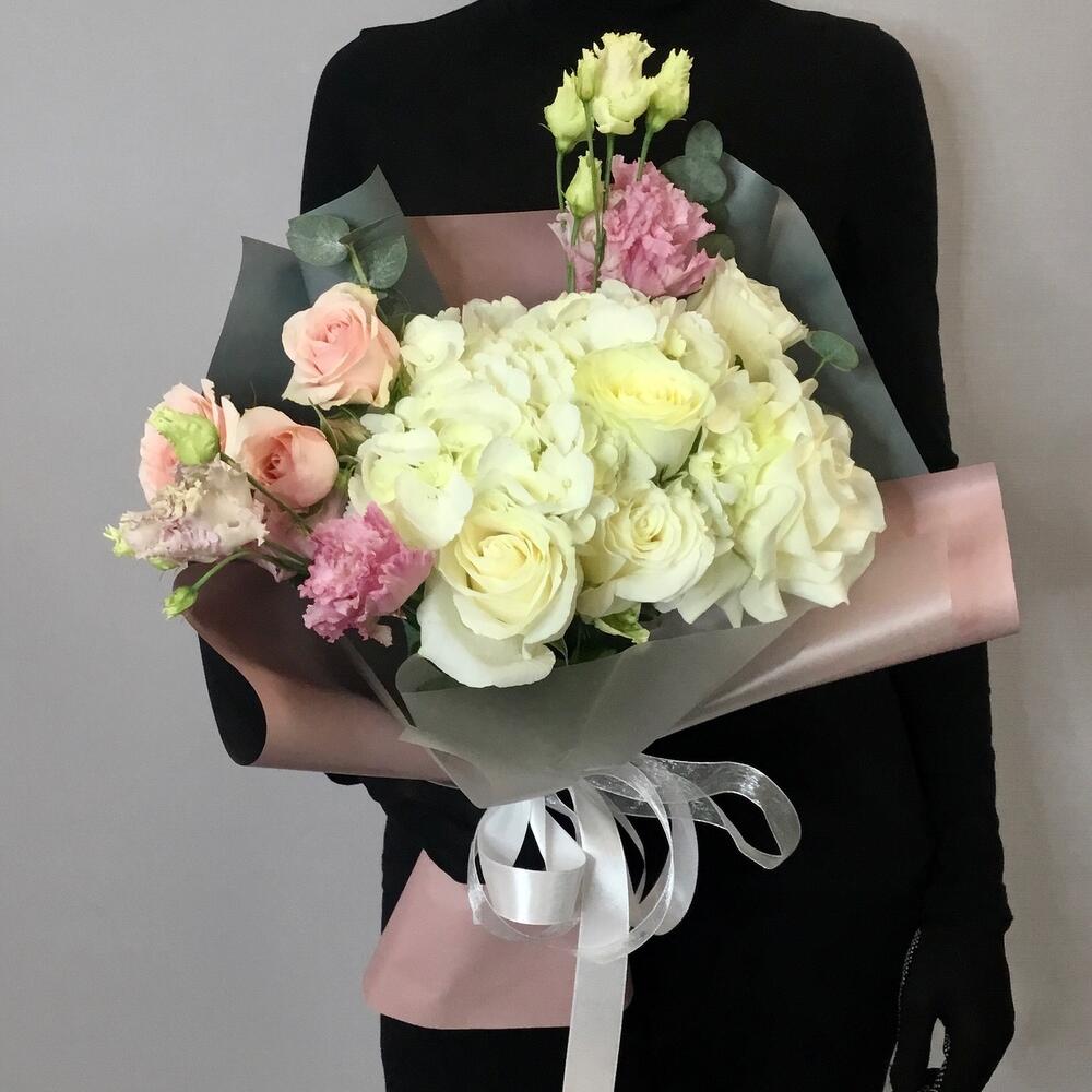 Букет с гортензией, розой Мондиаль и эустомой “Нежные нотки”
