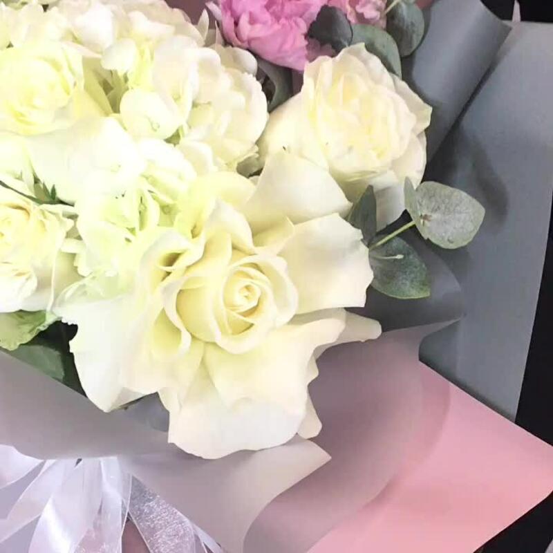 Гортензия – 1 шт.Эвкалипт – 2 шт.Кустовая роза – 1 шт.Эустома – 2 шт.Органза – 1 шт.Атласная лента – 1 шт.Французская роза – 1 шт.Пленка матовая – 2 шт.мондиаль роза – 3 шт.