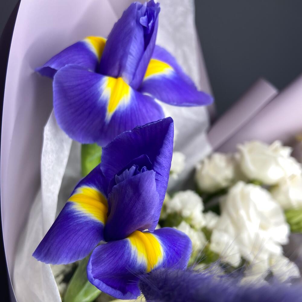 Упаковка – 1 шт.Статица белая – 1 шт.Ирис Blue Magic – 2 шт.Роза белая мондиаль – 1 шт.Мини гербера – 3 шт.Лагурус (сухоцвет) – 4 шт.лизиантус розита вайт – 1 шт.