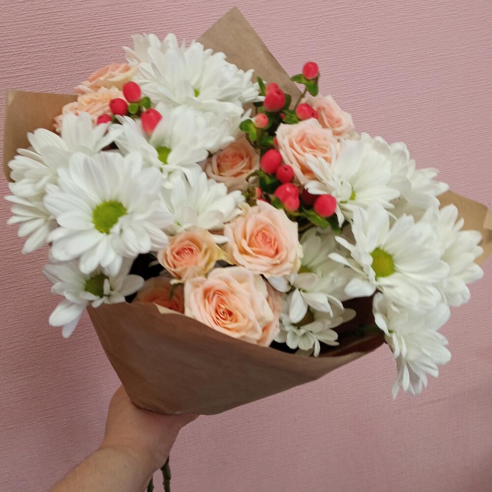 Гиперикум – 3 шт.Лента – 1 шт.Роза кустовая – 3 шт.Хризантема кустовая – 3 шт.Упаковка – 1 шт.зелень декоративная – 2 шт.
