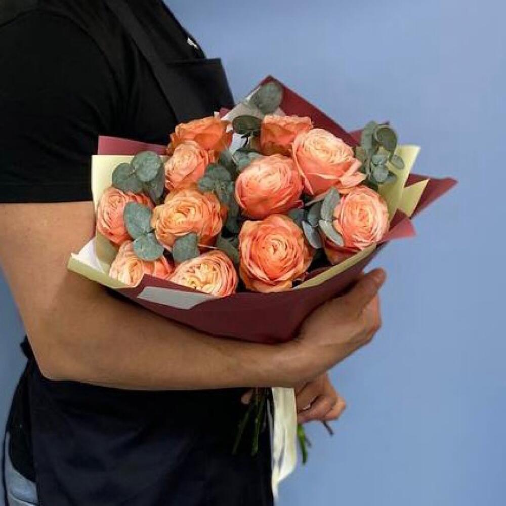 Пионовидная роза кахала – 11 шт.Эвкалипт – 5 шт.Упаковка дизайнерская – 2 шт.Лента атласная – 1 шт.