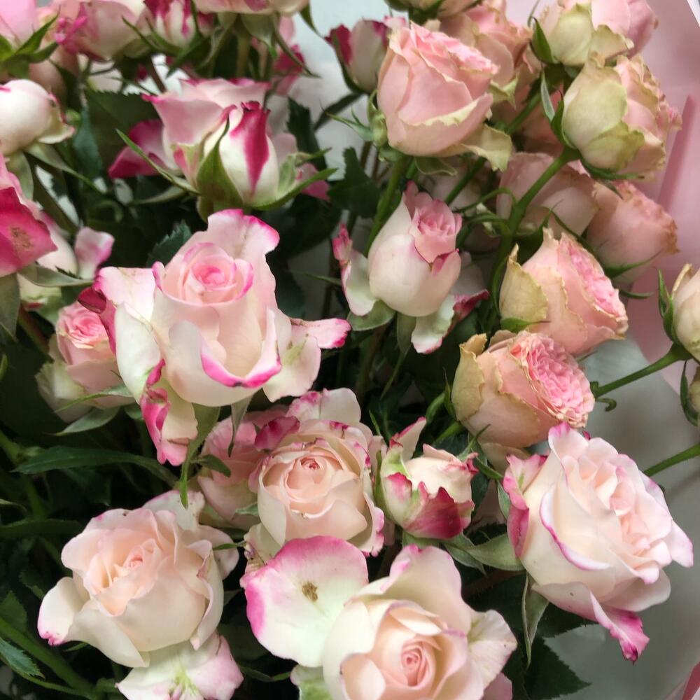 Роза кустовая – 9 шт.Тишью – 1 шт.Пленка матовая – 1 шт.Лента атласная – 1 шт.