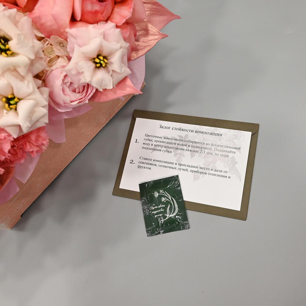 - Сроки возврата: Претензии по качеству букета принимаются в течение 24 часов с момента его получения.