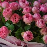 Букет из 9 кустовых пионовидных роз сорта Giselle, упаковка, атласная лента.