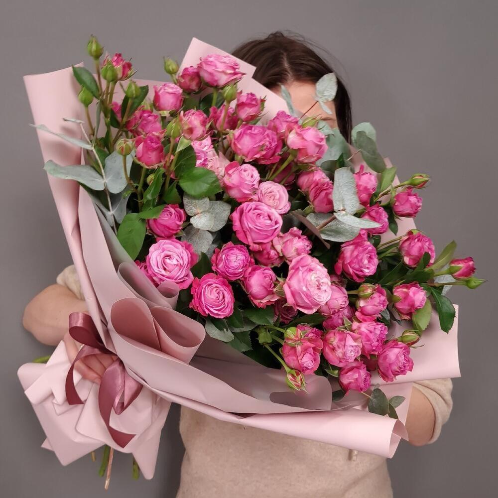 Пионовидная кустовая роза – 15 шт. Эвкалипт – 5 шт. Упаковка дизайнерская – 3 шт. Аквабокс – 1 шт.