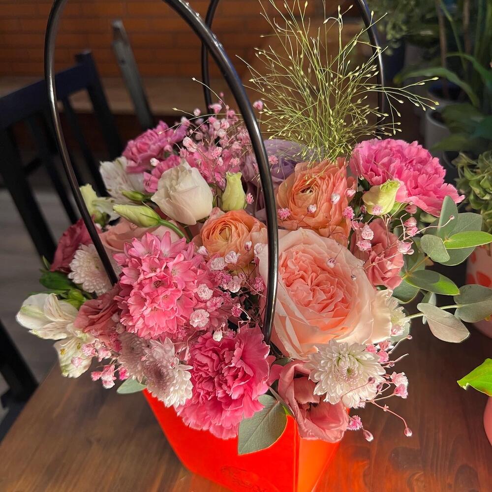 Альстромерия – 2 шт.Гиацинт – 1 шт.Гипсофила – 1 шт.Паникум – 1 шт.Хризантема кустовая – 1 шт.Роза одноголовая – 2 шт.Эустома – 2 шт.Диантус – 4 шт.Пионовидная роза одноголовая – 1 шт.ранункулюсы – 2 шт.зелень эвкалипта – 1 шт.