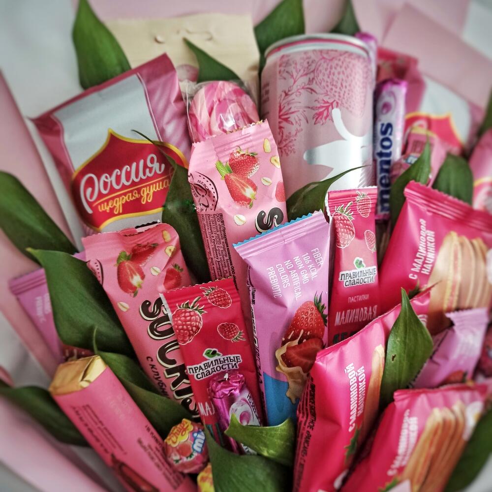 Леденец на палочке – 1 шт.рускус(зелень) – 22 шт.mentos pure – 3 шт.боржоми земляника – 1 шт.yota шарики с малиной – 1 шт.шоколад россия клубника и роза – 3 шт.basker wheels pancake малина – 3 шт.батончики so crispy клубника – 3 шт.батончики musler клубника в йогурте – 3 шт.малиновые пастилки – 3 шт.chupa chups mini клубника – 7 шт.шоколад ozera малина – 3 шт.