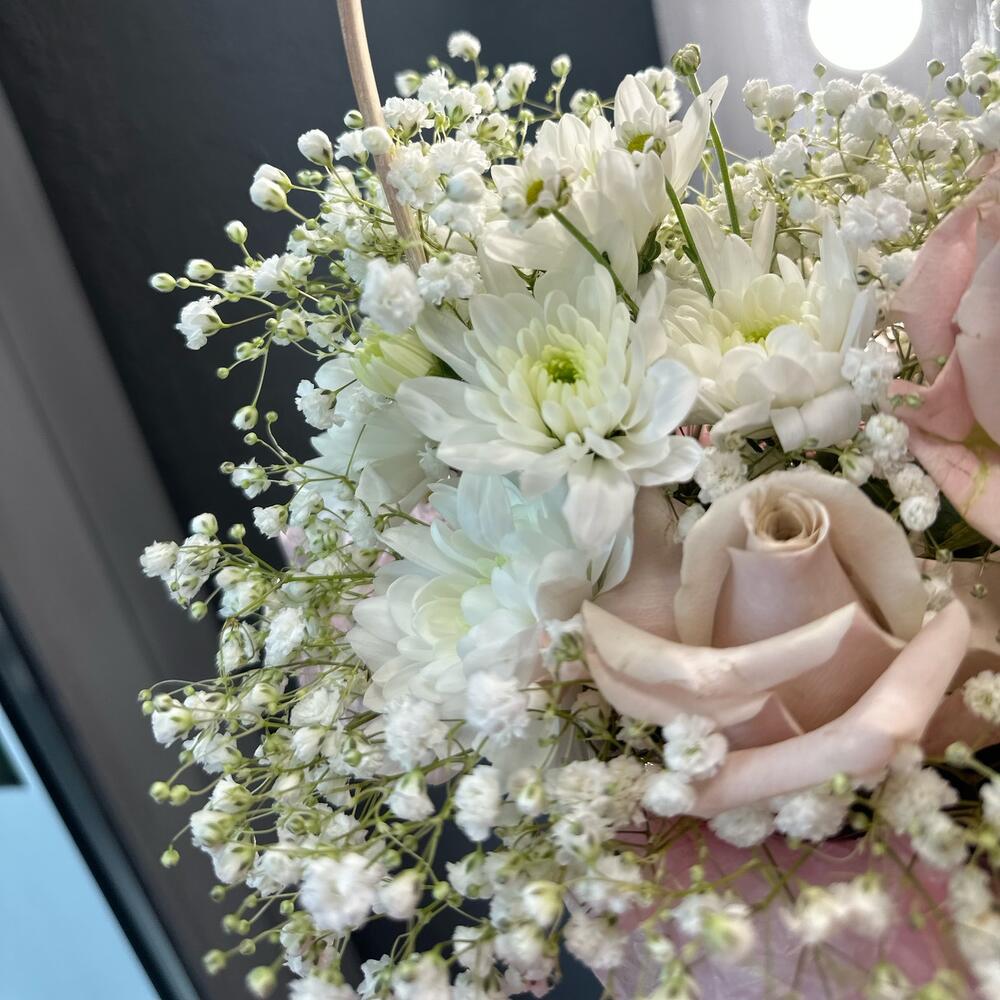 Гипсофила – 4 шт.Хризантема кустовая – 1 шт.Роза – 2 шт.Лента атласная – 1 шт.Тишью – 2 шт.Пленка – 1 шт.Корзина плетеная – 1 шт.Оазис флористический – 1 шт.