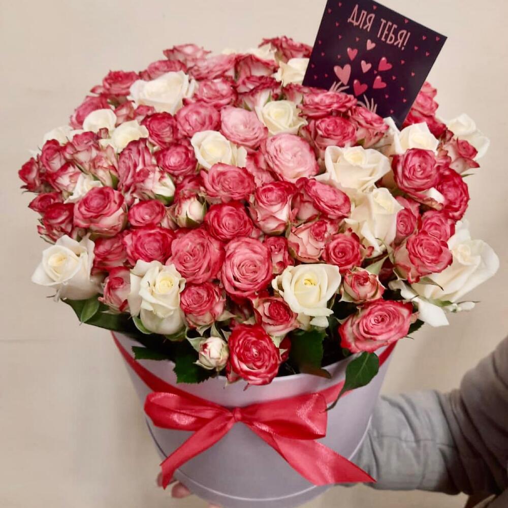 белые розы 40 см – 25 шт.кустовые розовые розы – 30 шт.шляпная коробка в ассортименте – 1 шт.Оазис флористический – 1 шт.лента в ассортименте – 1 шт.
