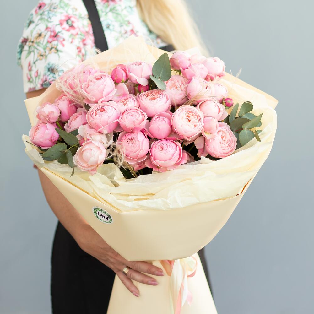 кустовая пионовидная роза сильвия пинк – 10 шт. Стифа – 3 шт. Эвкалипт – 3 шт.