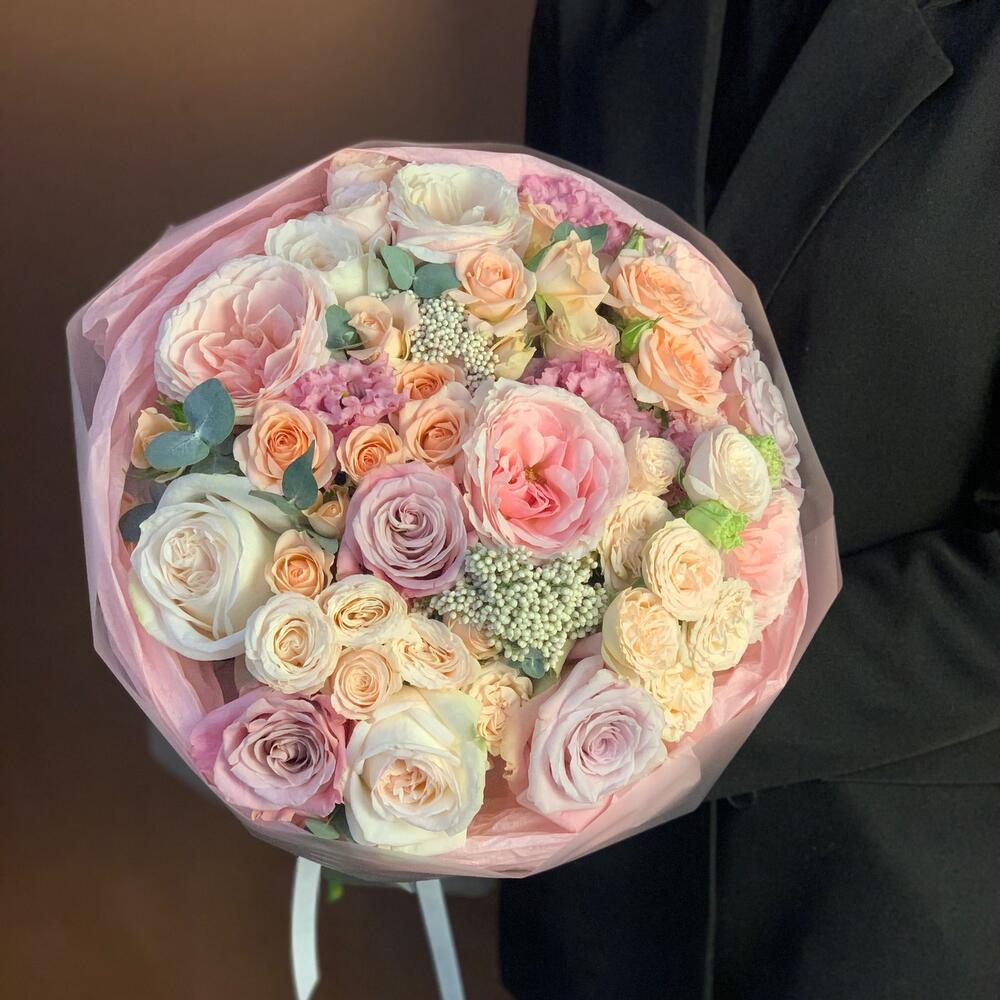 Кустовая роза – 5 шт.Лизиантус – 3 шт.Озотамнус – 2 шт.цумуги – 5 шт.фейт – 3 шт.white o’hara – 5 шт.Тишью – 3 шт.Корейская пленка – 3 шт.Лента атласная – 1 шт.