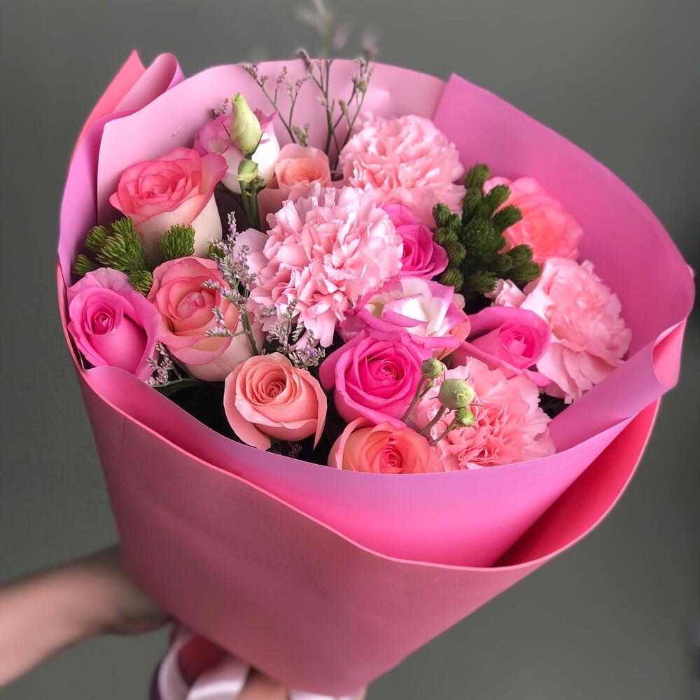 Розы, кустовые розы, пионовидные розы, гвоздики, зелень. Букет среднего размера