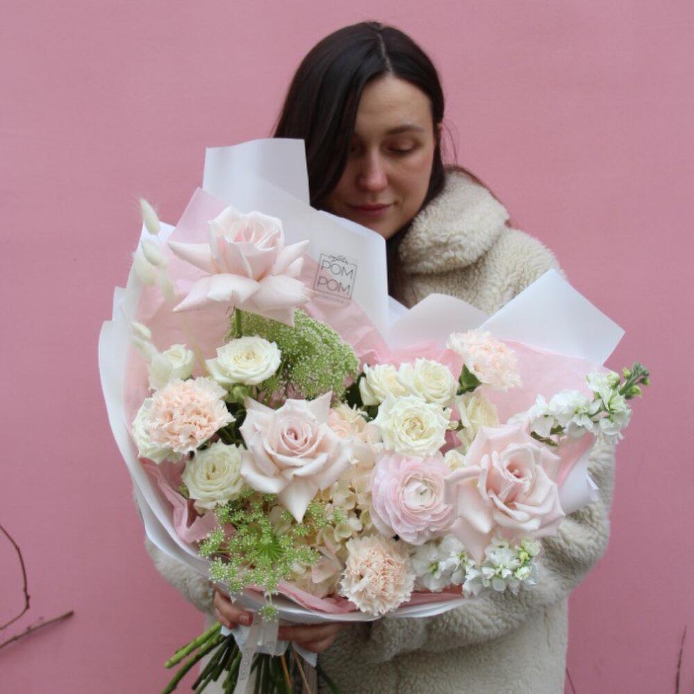 Роза – 5 шт.Амми – 2 шт.Маттиола – 2 шт.Гортензия – 1 шт.Гвоздика – 3 шт.Лагурус – 3 шт.Упаковка дизайнерская – 1 шт.