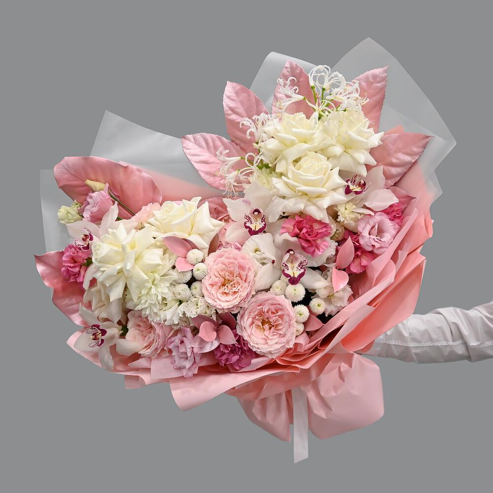Пионовидная кустовая роза – 4 шт.Французская роза – 6 шт.Эустома – 6 шт.Рускус – 6 шт.Хризантема одноголовая – 2 шт.Гортензия – 1 шт.Гвоздика – 7 шт.Сантини – 4 шт.Нерина – 2 шт.ЦИМБИДИУМ – 5 шт.Пионовидная роза – 3 шт.Магнолия – 2 шт.Аралия – 1 шт.Упаковка дизайнерская – 2 шт.