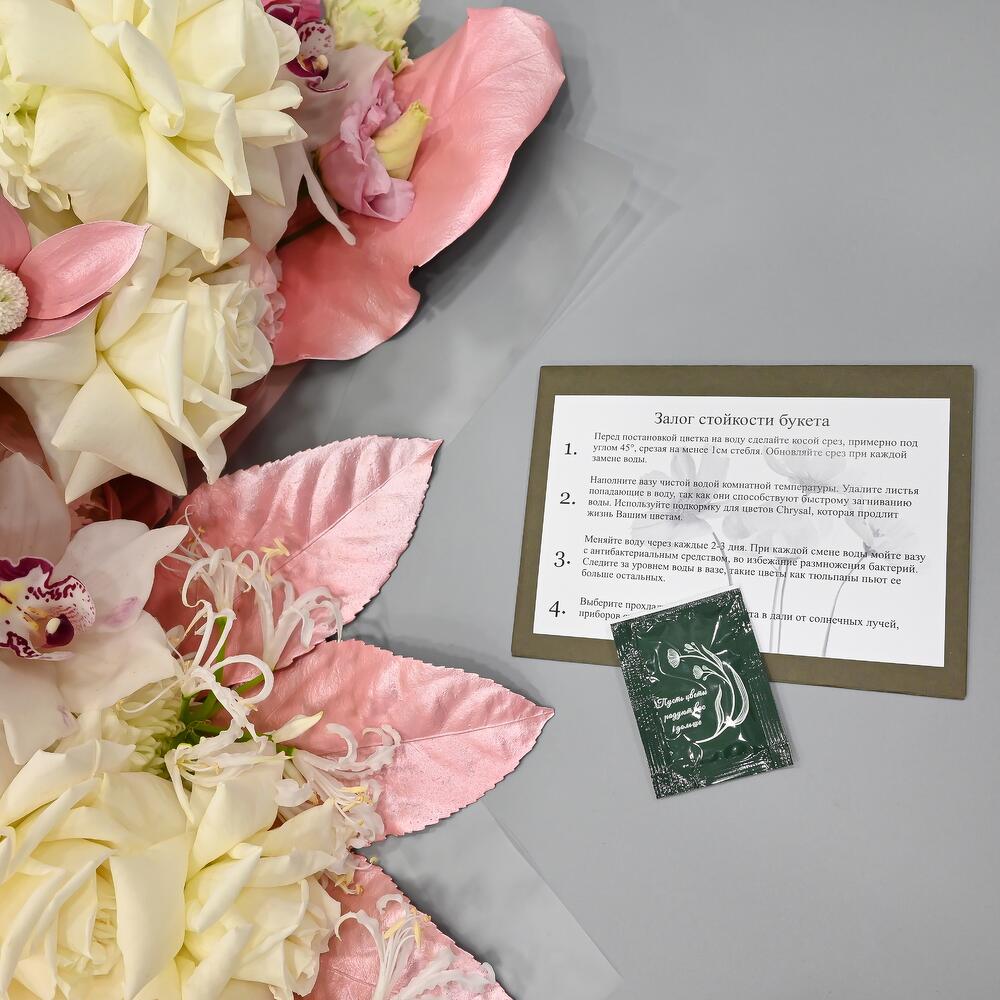 - Сроки возврата: Претензии по качеству букета принимаются в течение 24 часов с момента его получения.