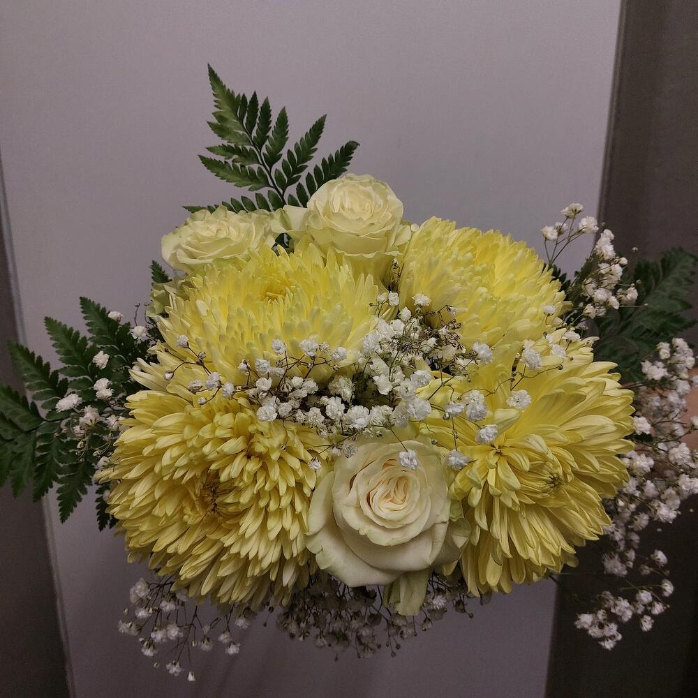 Хризантема одноголовая – 4 шт.Роза Мондиаль – 3 шт.Гипсофила – 2 шт.Листья папоротника – 3 шт.Упаковка дизайнерская – 2 шт.Лента атласная – 2 шт.