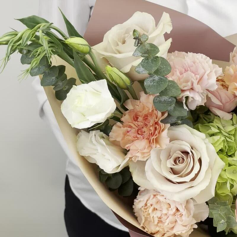 Гортензия – 1 шт.Диантус – 5 шт.Роза пионовидная – 4 шт.Упаковка дизайнерская – 3 шт.эустома белая – 2 шт.Эвкалипт Baby Blue – 6 шт.Кустовая роза пионовидная – 2 шт.