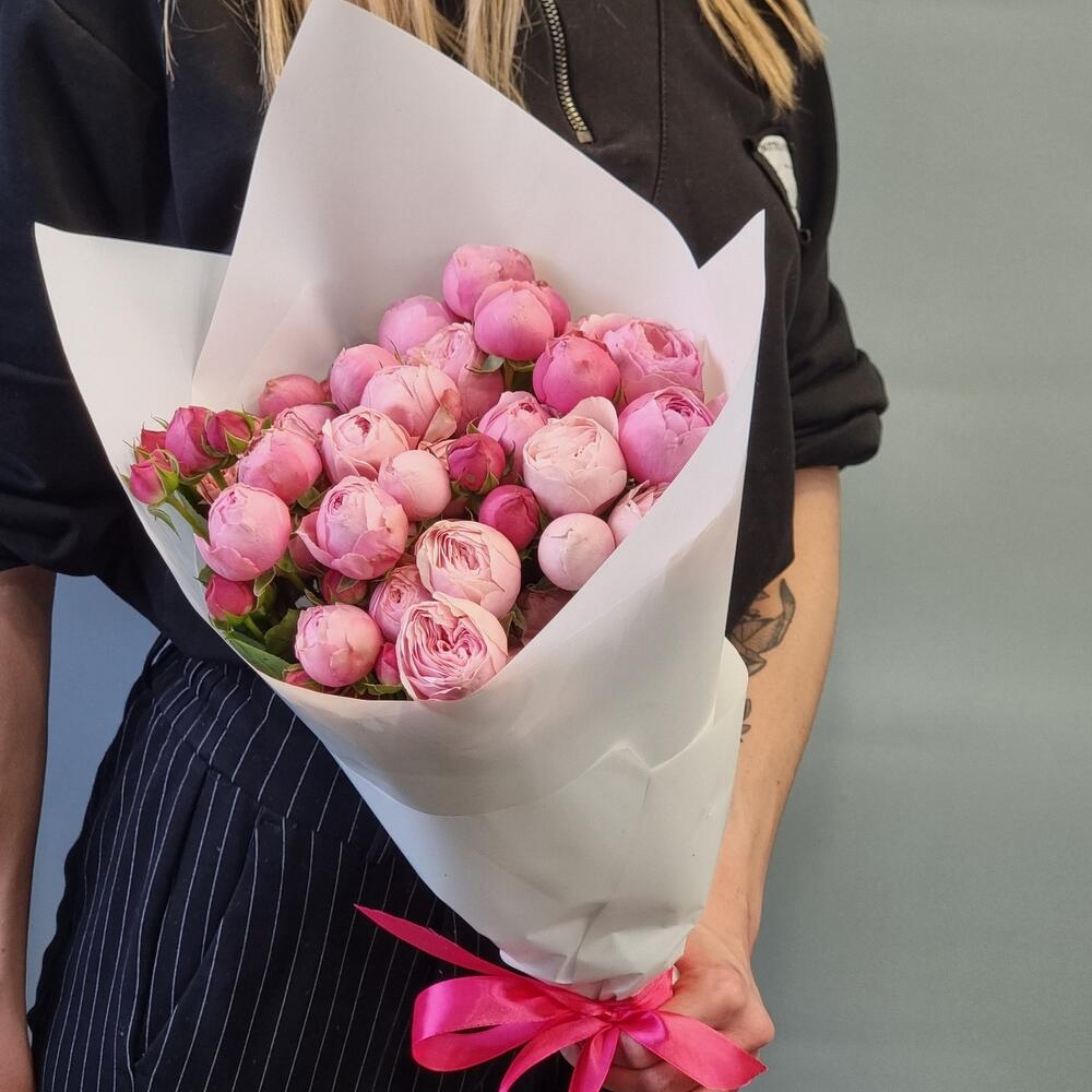 Лента атласная – 1 шт.Пленка матовая – 1 шт.silva pink кустовая роза – 5 шт.