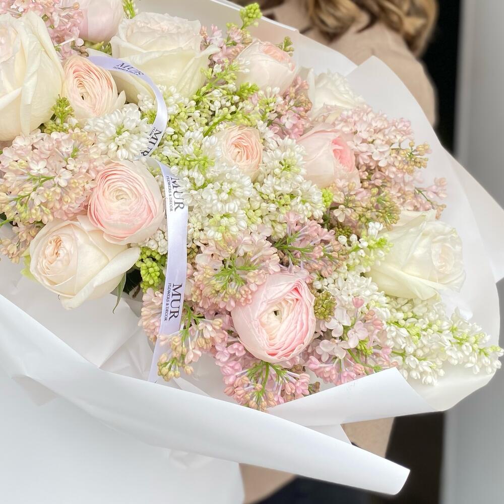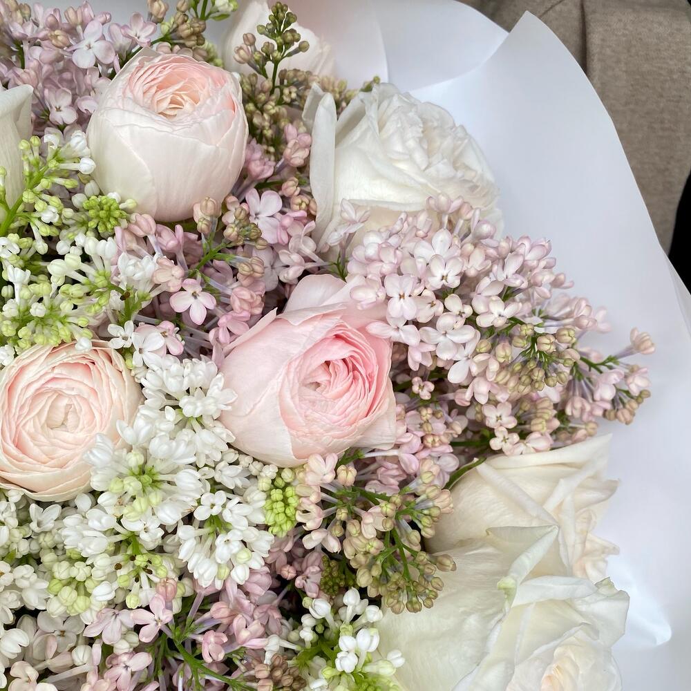 Сирень – 17 шт.Лента атласная – 1 шт.Ранункулюс – 8 шт.Упаковка дизайнерская – 3 шт.роза охара пионовидная – 5 шт.