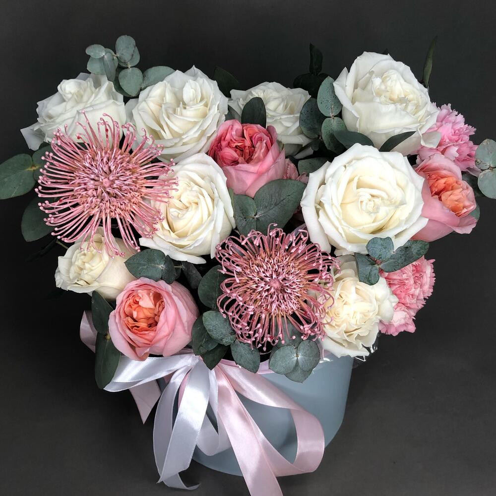 Роза пионовидная – 11 шт.Эвкалипт – 4 шт.Диантус – 3 шт.леукоспермум розовый – 2 шт.Оазис флористический – 2 шт.Коробка – 1 шт.Лента атласная – 3 шт.