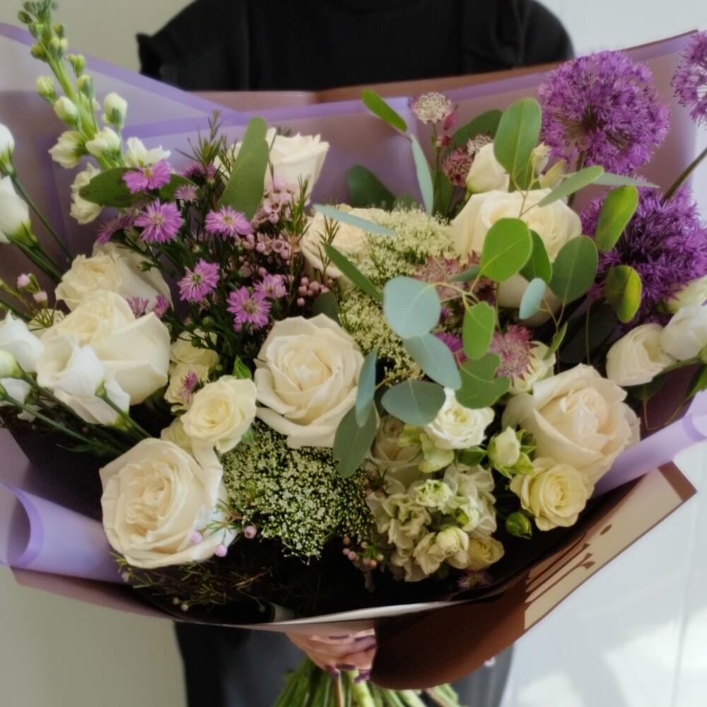 Роза – 9 шт.Роза кустовая – 4 шт.Лизиантус – 3 шт.Аллиум – 3 шт.Трахелиум – 3 шт.Астра кустовая – 3 шт.Астранция – 2 шт.Маттиола – 3 шт.васкфлауэр – 2 шт.Эвкалипт – 2 шт.Фисташка пучок – 1 шт.Упаковка дизайнерская – 5 шт.