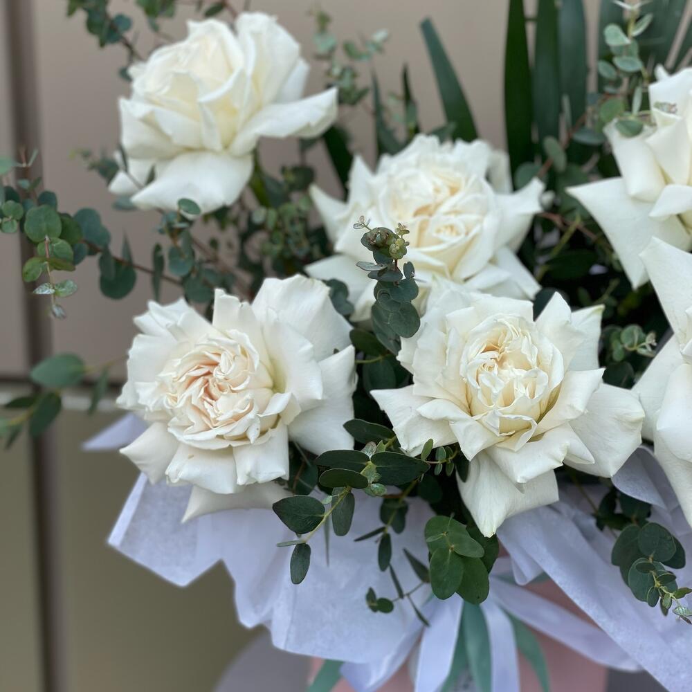 Эвкалипт – 4 шт.Роза Эквадор – 7 шт.Лента атласная – 2 шт.Тишью – 4 шт.Чико – 2 шт.Оазис флористический – 1 шт.