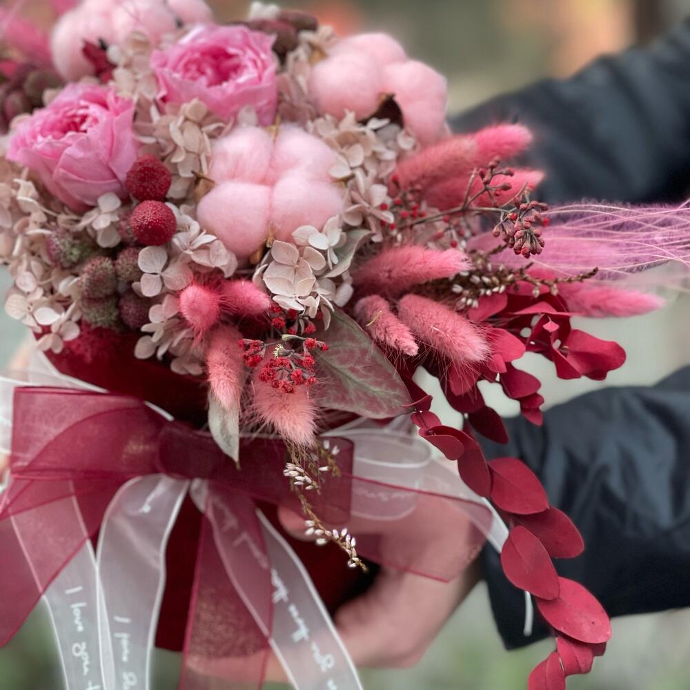 Композиция из стабилизированных цветов в оттенках вишнёвого ликёра.Цветы не требуют ухода,жизнь стабилизированных цветов в среднем 5 лет.