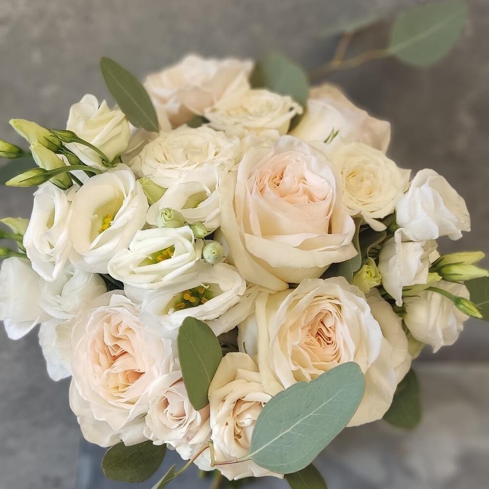 Лизиантус – 5 шт.Роза кустовая – 5 шт.Эвкалипт – 2 шт.Роза одноголовая – 5 шт.Лента атласная – 1 шт.