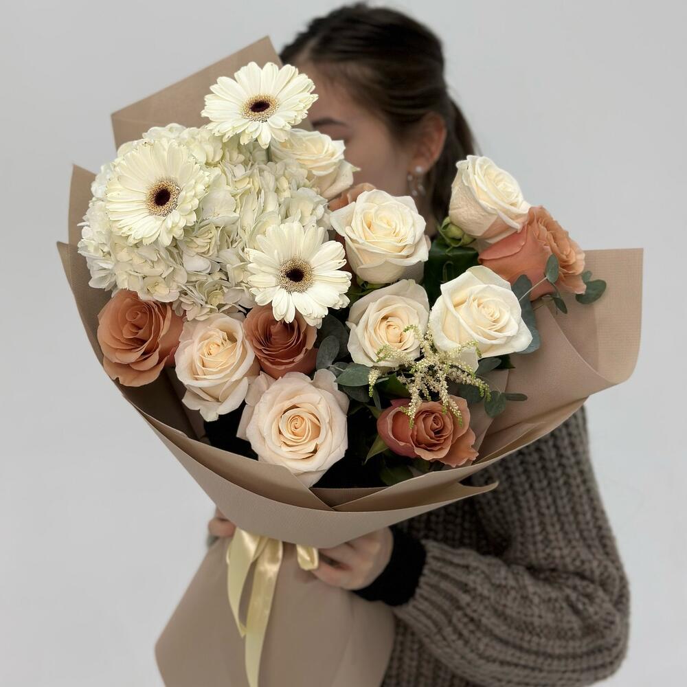 Флористы из студии “Varda Flowers” подобрали свежие и красивые цветы для создания букета, который наполнен положительными эмоциями и любовью. Они тщательно расположили каждый цветок в букете, учитывая его форму и цветовую гамму, чтобы достичь наилучшего гармоничного и красивого результата.