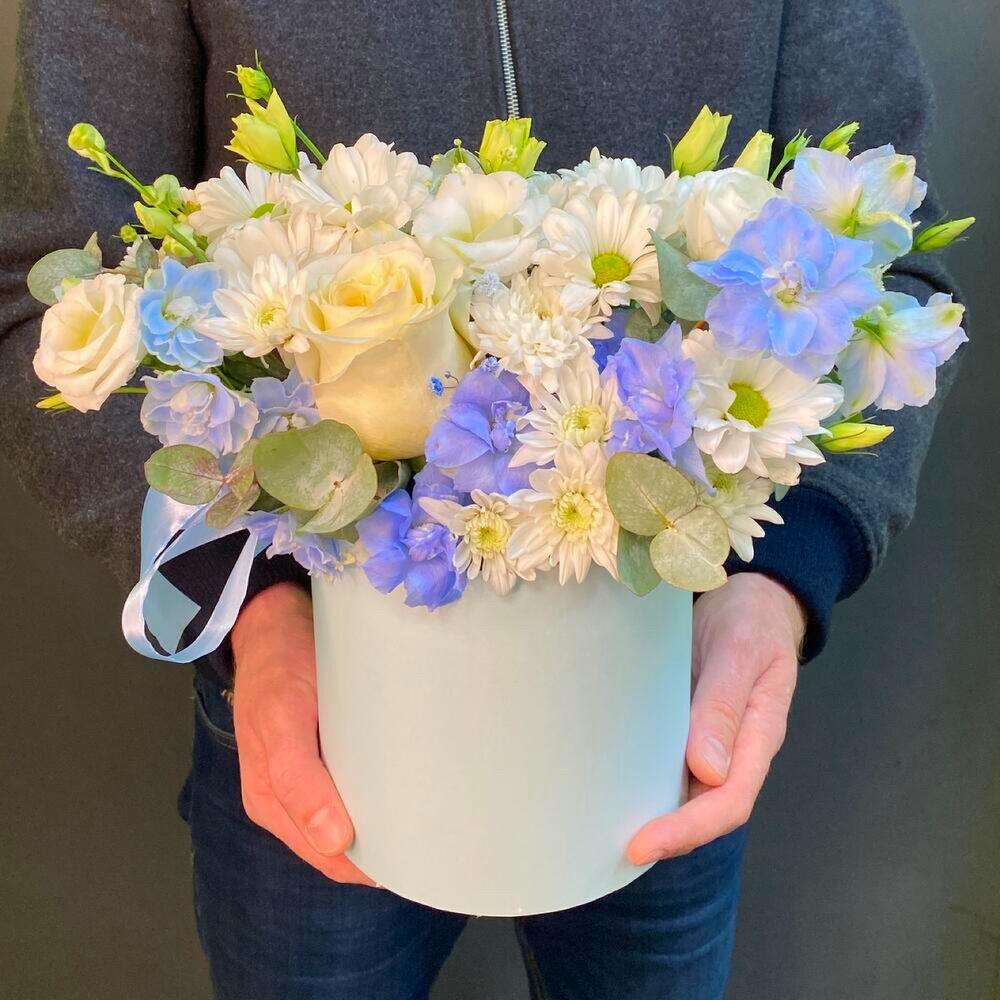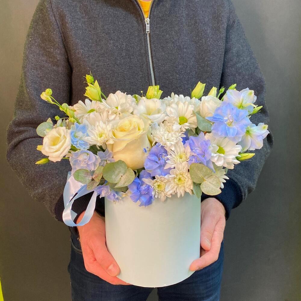 Дельфиниум голубой – 1 шт.Роза Эквадор – 1 шт.Хризантема кустовая – 5 шт.Лизиантус – 2 шт.Эвкалипт – 1 шт.Шляпная коробка с лентами – 1 шт.