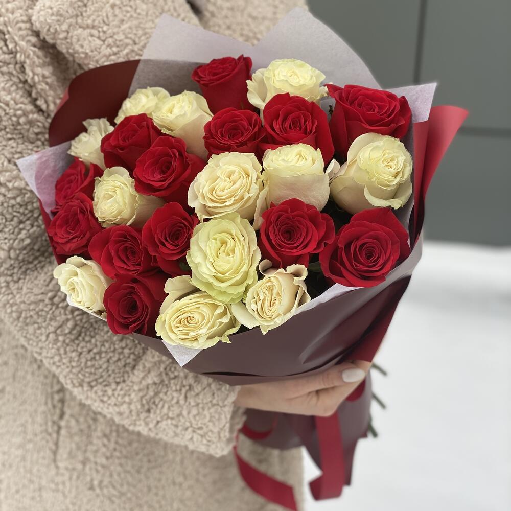 Влюбленный взгляд из 25 красных и белых роз в оформлении