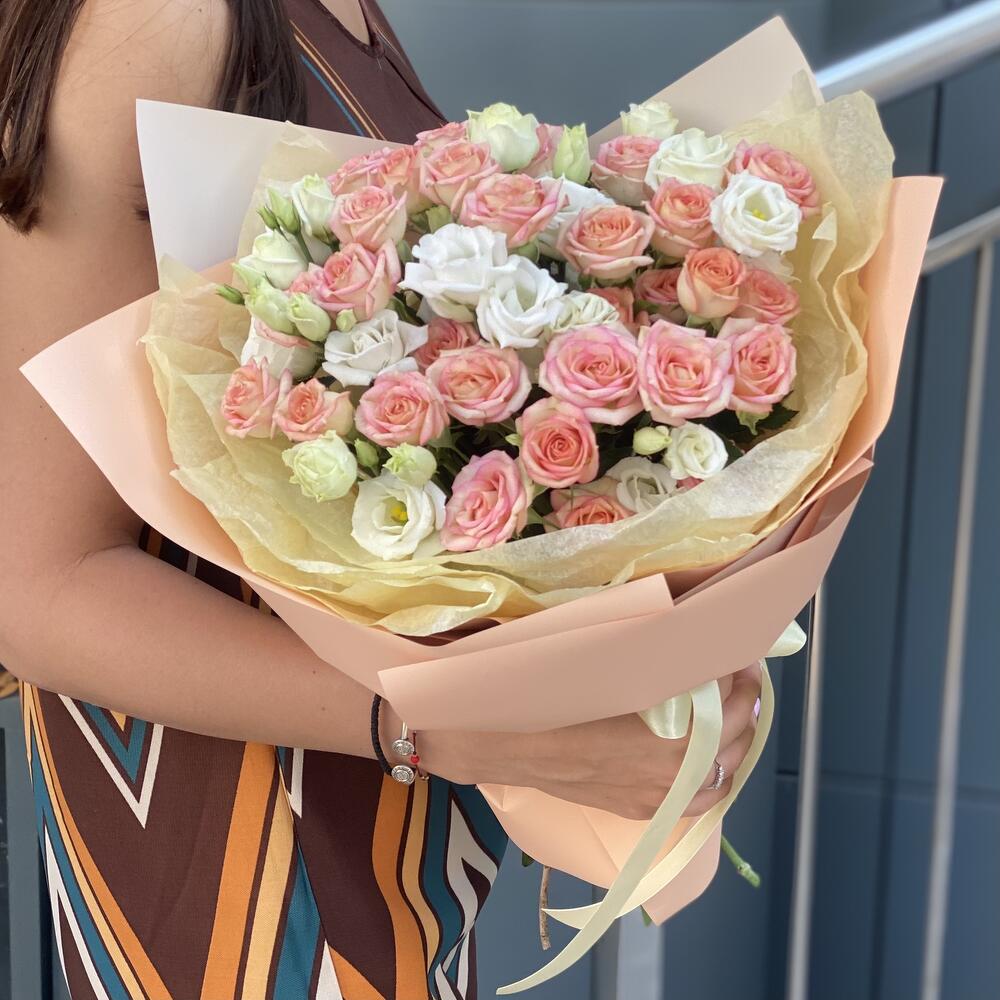 кустовая роза азора – 5 шт. эустома белая – 4 шт. Оформление – 1 шт. Писташ – 2 шт.