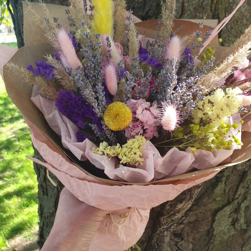 Колоски – 11 шт.Крафт упаковка – 2 шт.Лаванда (сухоцвет) пучок – 1 шт.Шпагат джутовый – 1 шт.гипсофила сухоцвет ветка – 1 шт.лагурус (сухоцвет) розовый – 7 шт.статица синяя сухоцвет – 3 шт.статица желтая сухоцвет – 2 шт.розы сухоцвет микс – 3 шт.краспедия желтая сухоцвет – 2 шт.статица розовая сухоцвет – 1 шт.