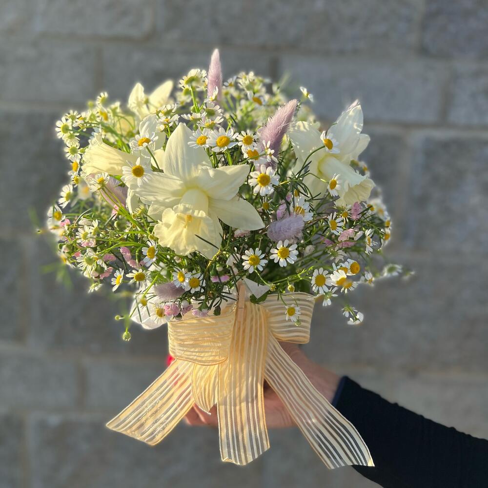 Цветы в коробке с нарциссами , ромашками и лагурусом