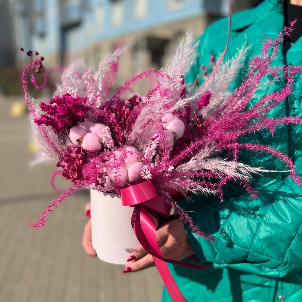Хлопок – 5 шт.Лента атласная – 2 шт.Коробка шляпная – 1 шт.Ягоды декоративные – 8 шт.Оазис для сухоцветов – 1 шт.овес сухоцвет – 3 шт.кортадерия – 5 шт.гортензия стабилизированная – 1 шт.мискантус – 1 шт.солидаго стабилизированный – 2 шт.