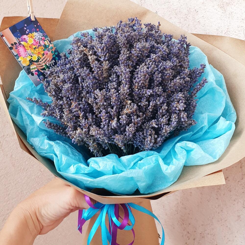 Лаванда (сухоцвет) – 150 гр.Лента атласная – 2 шт.Крафт упаковка – 1 шт.Открыточка с вашими пожеланиями – 1 шт.тишью бирюзовое – 3 шт.