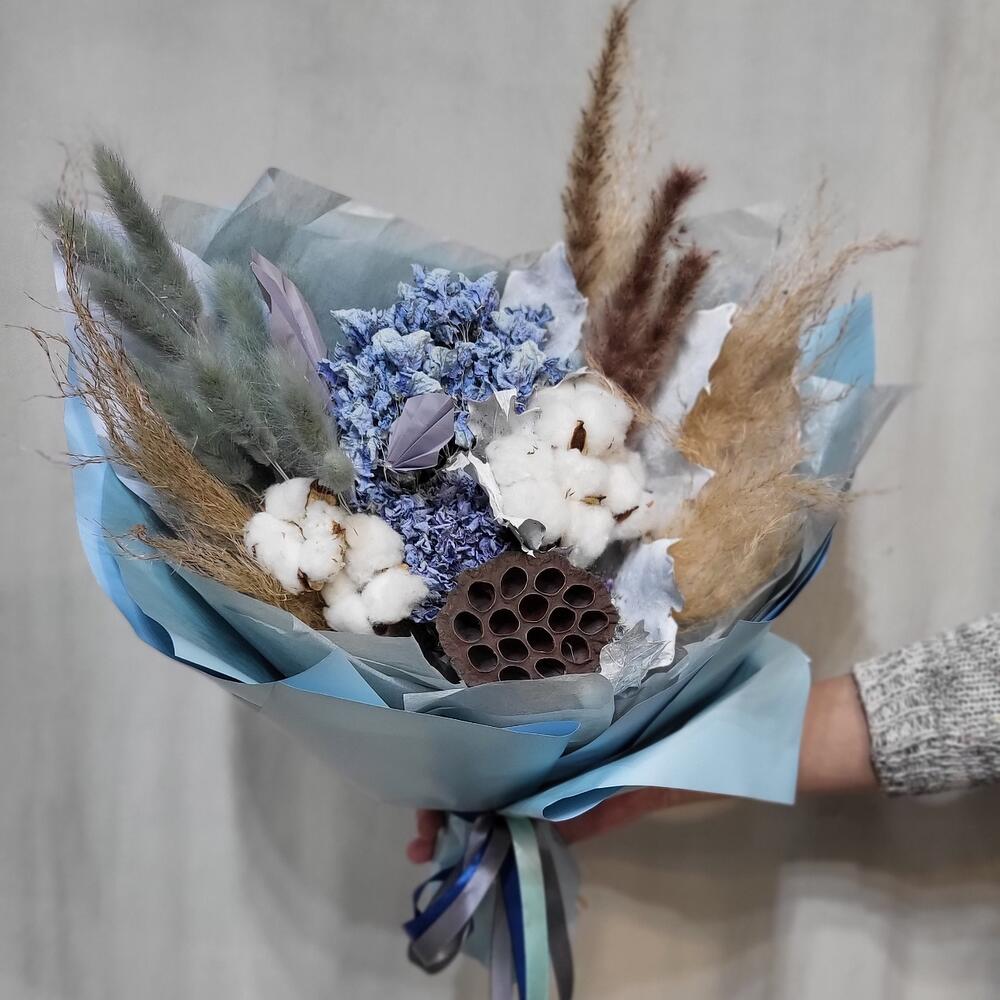 Гортензия – 2 шт.Лотос – 1 шт.Лагурус – 11 шт.кортадерия – 1 шт.Хлопок натуральный – 7 шт.бумага дизайнерская – 1 шт.