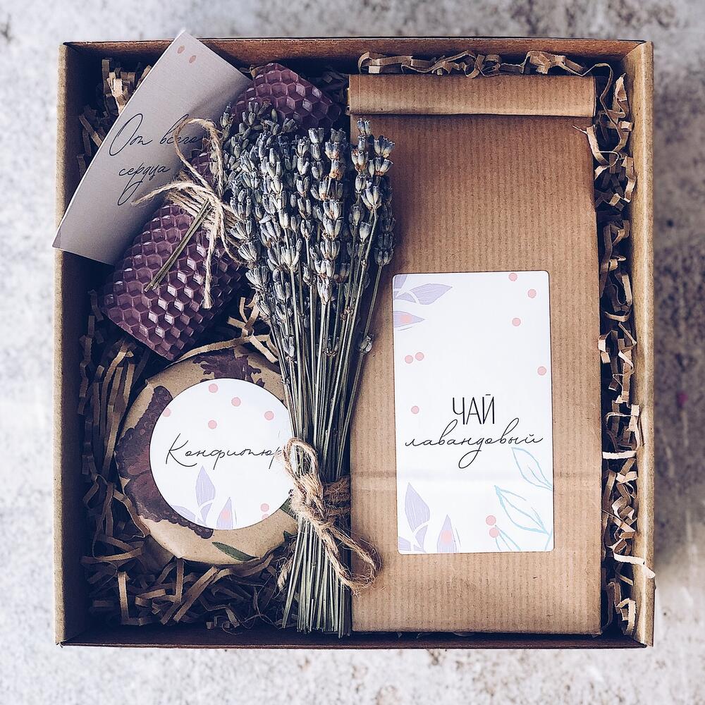 •открытка – 1 шт.•подарочная коробка – 1 шт.•букет крымской лаванды – 1 шт.•лавандовый чай – 50 гр.•свеча медовая с сухоцветами – 1 шт.•конфитюр ягодный – 100 гр.