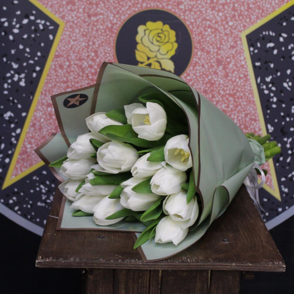 Лента атласная – 1 шт.Тюльпан белый (голландия) – 15 шт.Пленка дизайнерская – 2 шт.