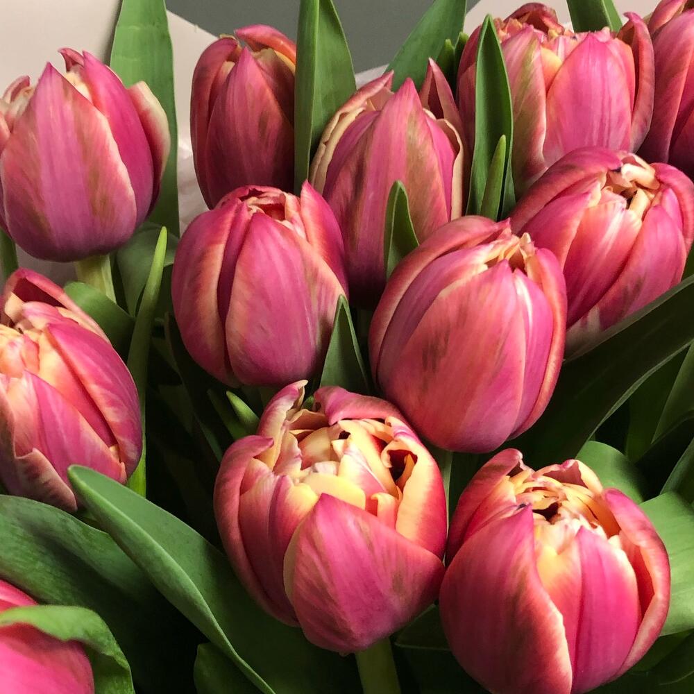 Букет из 25 тюльпанов пионовидных микс в дизайнерской упаковке
