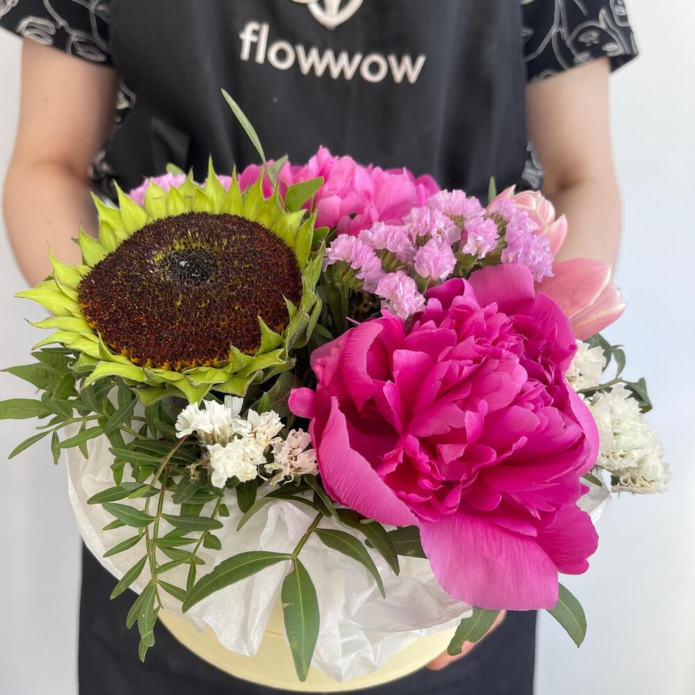 Пион – 2 шт.Тюльпан – 2 шт.Статица – 3 шт.Подсолнух – 1 шт.Тишью – 1 шт.Фисташка – 4 шт.Коробка шляпная – 1 шт.Оазис – 1 шт.