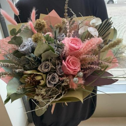 Авторский букет из пионовидных роз, оксипеталум и астильба «Очарование»